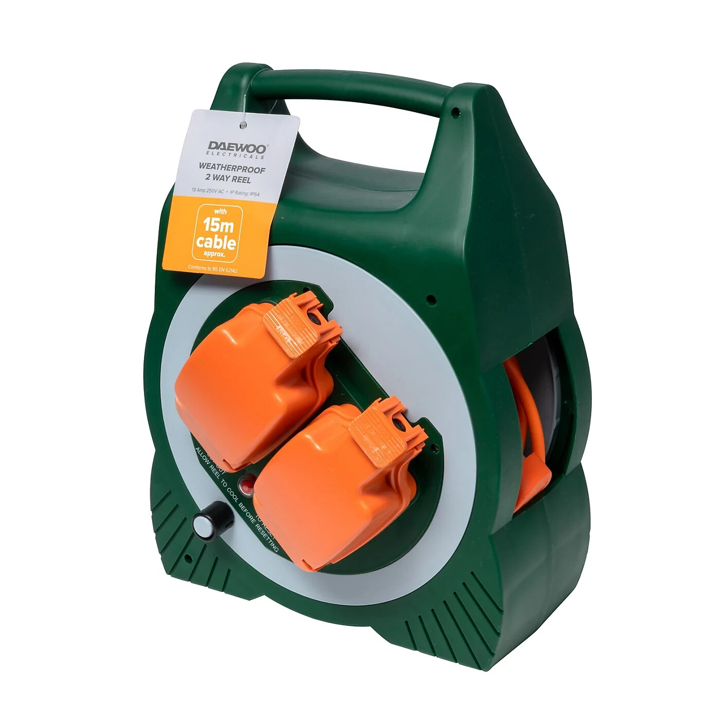 Daewoo Weatherproof 2-Way 15m Extension Reel IP54 Outdoor Cable Lead Gang Socket