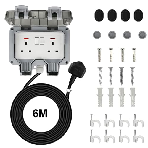 Bkiyougo Double Socket, outdoor sockets waterproof IP66 with 6M Extension Lead, Weatherproof Outdoor Plug Sockets, Exterior Wall Garden, 2 Gang Storm Switched Socket Outside Power Socket