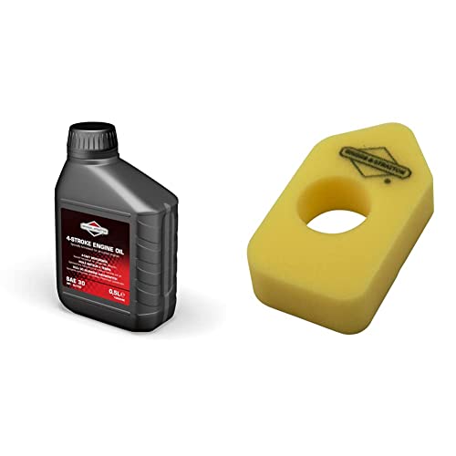 Briggs & Stratton 100004E 4-Stroke Lawn Mower Engine Oil SAE30, 500ml, Black, 0.5 Litre & 698369 Yellow Foam Air Filter. Classic, Sprint & Quattro Engine
