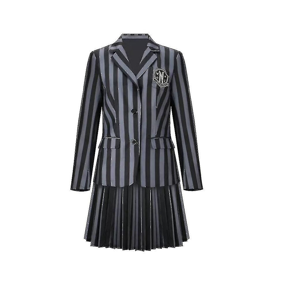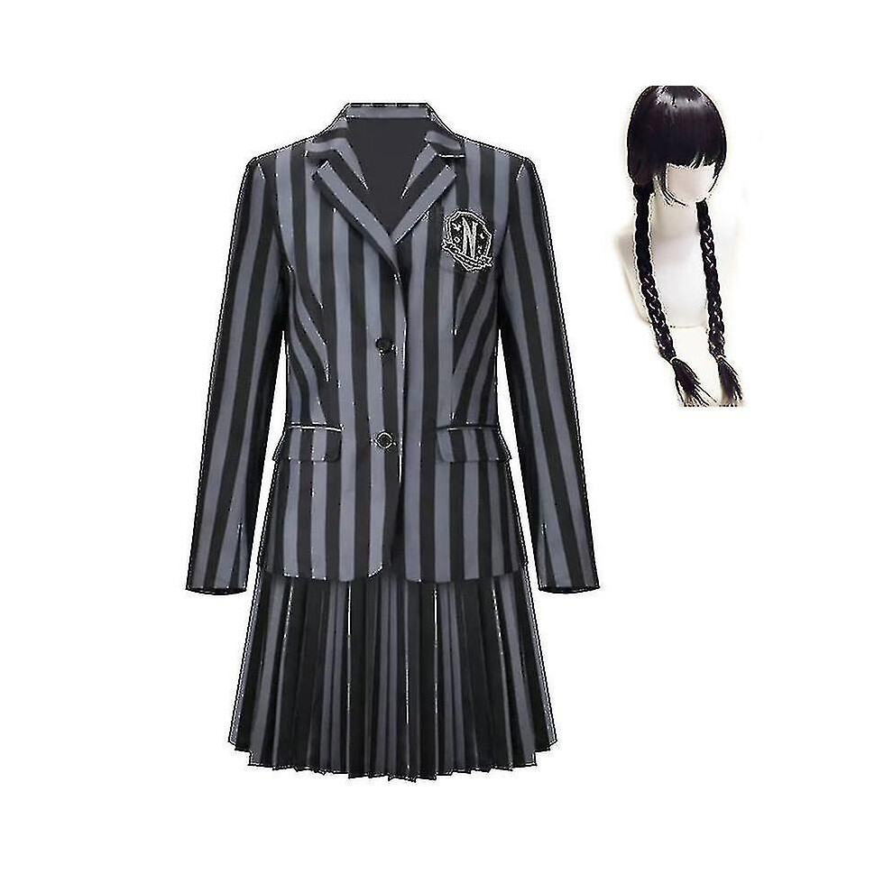 (With wig, Child L) Wednesday Addams Cosplay Costume Set Nevermore Academy School Uniform Halloween Carnival Party Costume For Adults Kids _a1