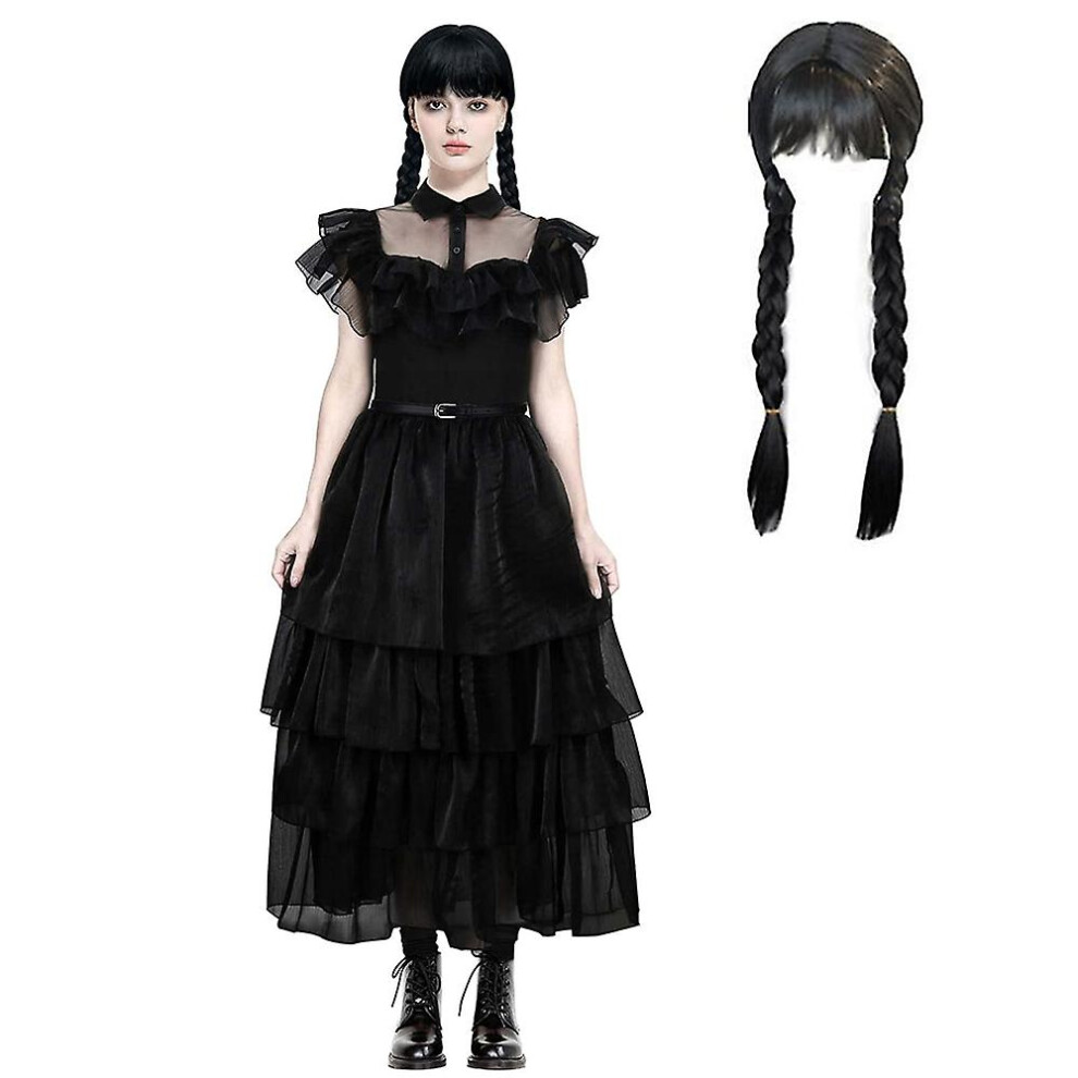 (With wig, Adult M) Wednesday Addams Cosplay Costume Set Nevermore Academy School Uniform Halloween Carnival Party Costume For Adults Kids _a1