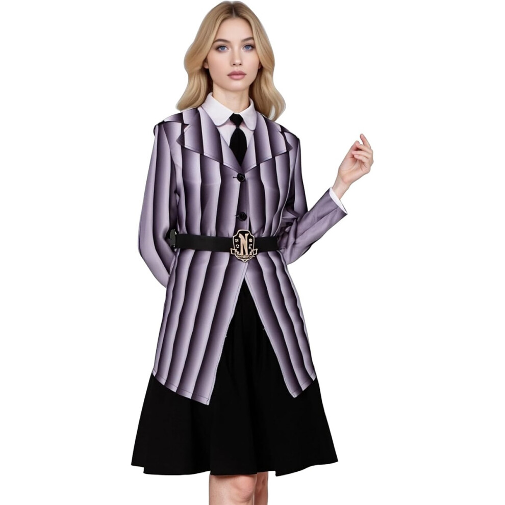 (XXL) Wednesday Doll School Uniform Cosplay Costume | Halloween 2025 Women's Striped Suit Set