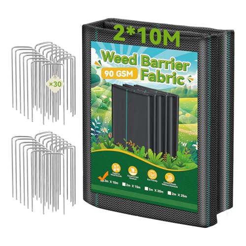 Domusensus Weed Control Membrane 2m x 10m - with 30 U-Shaped Garden Pegs Heavy Duty Weed Control Barrier Fabric Landscape for Vegetable Garden, Garden, Water Permeable Fabric,Black Woven Ground Cover