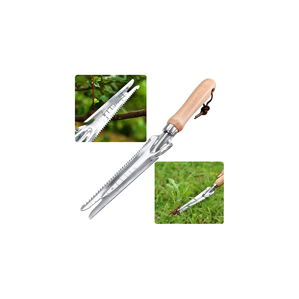 Garden Tools Multifunctional Manual Weeder Wooden Handle Weeding Tool, Stainless Steel Weeder with Measure, Mower Tool, Weed Puller, Weeder Shovel for