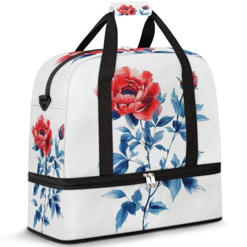 Travel Duffel Bag with Shoes Compartment & Trolley Sleeve Watercolor Peony Flower Sports Gym Bag Foldable Weekend Bags for Women Men