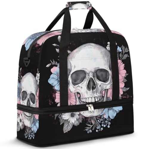 Travel Duffel Bag with Shoes Compartment & Trolley Sleeve Skull Flower Sports Gym Bag Foldable Weekend Bags for Women Men