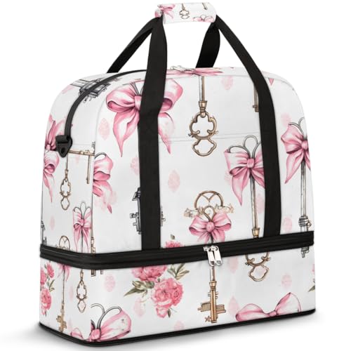 Travel Duffel Bag with Shoes Compartment & Trolley Sleeve Medieval Key Pink Bow Sports Gym Bag Foldable Weekend Bags for Women Men
