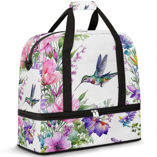 Travel Duffel Bag with Shoes Compartment & Trolley Sleeve Hummingbird Flowers Sports Gym Bag Foldable Weekend Bags for Women Men