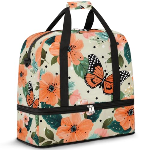 Travel Duffel Bag with Shoes Compartment & Trolley Sleeve Vintage Floral Butterfly Flower Sports Gym Bag Foldable Weekend Bags for Women Men