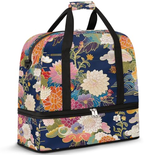 Travel Duffel Bag with Shoes Compartment & Trolley Sleeve Japanese Classical Blooming Flowers Sports Gym Bag Foldable Weekend Bags for Women Men