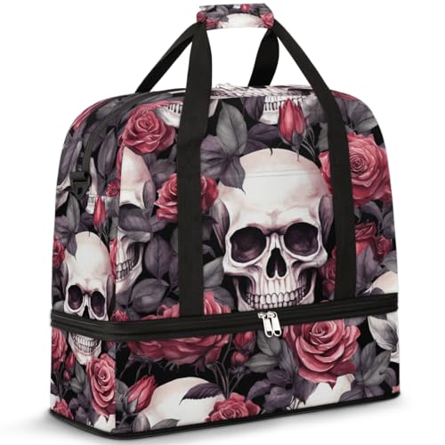Travel Duffel Bag with Shoes Compartment & Trolley Sleeve Rose Skull Gothic Skeleton Sports Gym Bag Foldable Weekend Bags for Women Men