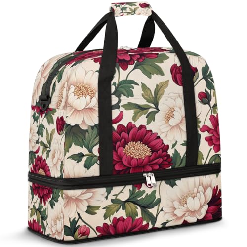 Travel Duffel Bag with Shoes Compartment & Trolley Sleeve Red White Classical Peony Flower Sports Gym Bag Foldable Weekend Bags for Women Men