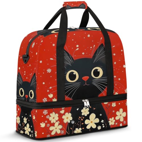 Mexpekil Black Cat Flowers Travel Duffel Bag Waterproof Sports Gym Bag Large Weekend Overnight Bags for Women Men Foldable Carry On Luggage Tote Bag for Flight