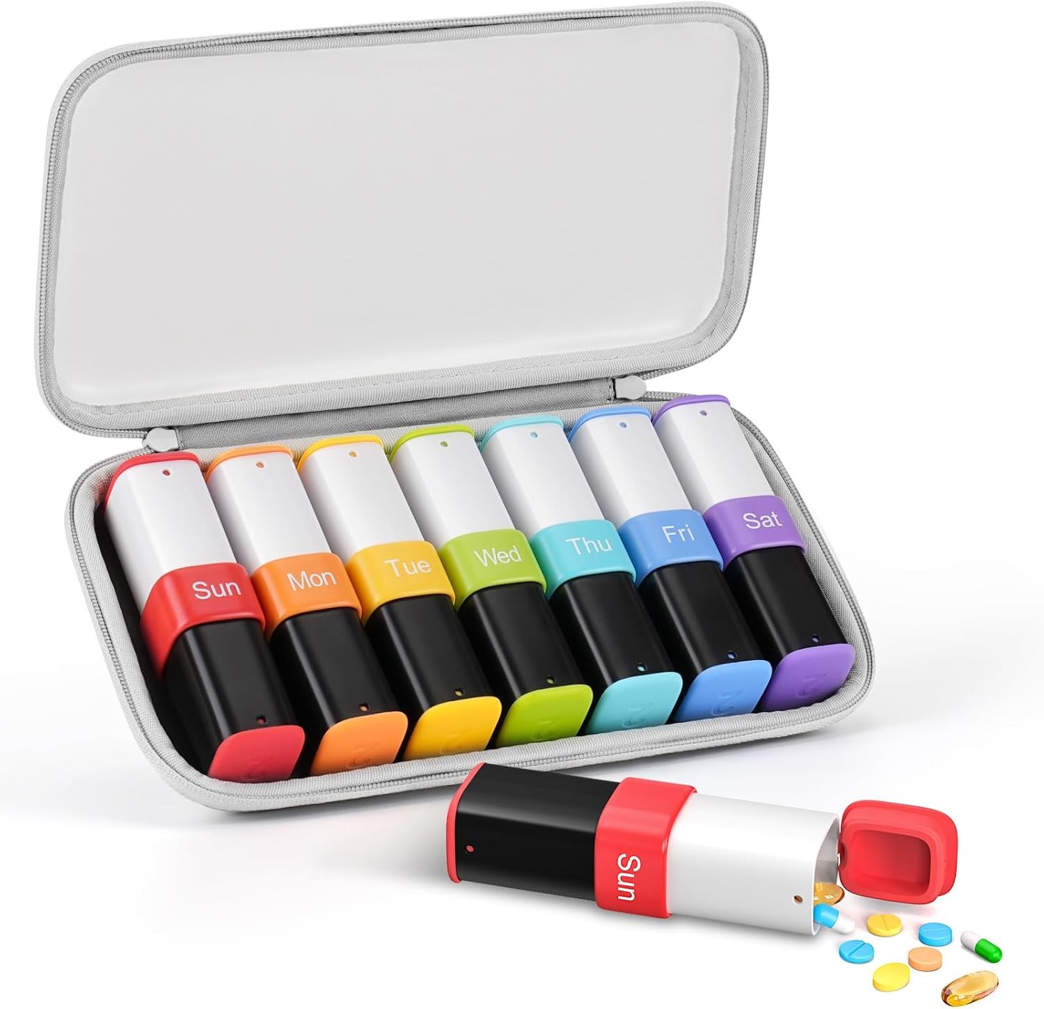 Opret Weekly Pill Organiser, Pill Box 7 Day 4 Times a Day with case, Portable Travel Tablet Organiser with 28 Compartments, for Vitamin Fish Oil Supplements Medication (Black-Rainbow)
