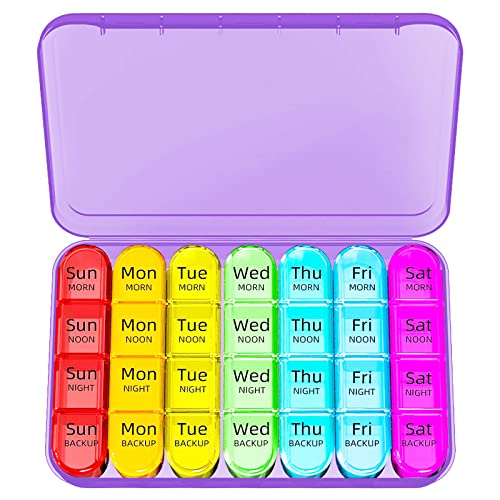 Doruimi Weekly Pill Box Organiser, Small Pill Box 7 Day 4 Times A Day, Pill Organiser with 28 Copartments to Hold Plenty of Medication, Vitamins and Supplements - Purple Case