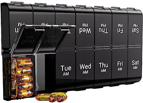 Opret Pill Organiser 7 Day, Weekly Pill Box 2 Times a Day for AM PM, Travel Tablet Organiser with 14 Large Compartments, for Vitamins Supplements Medication (Black)