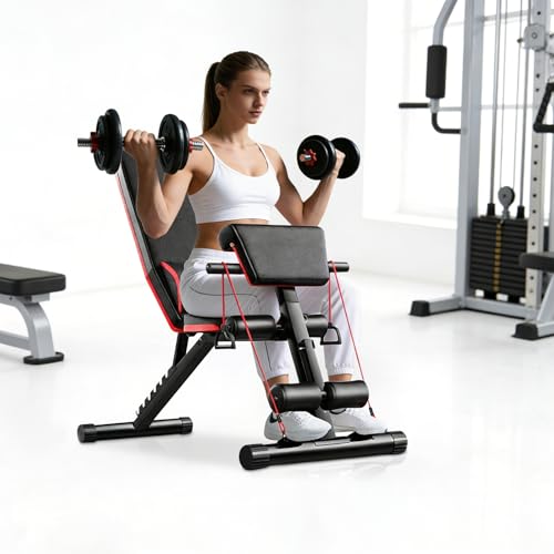 Adjustable Weight Bench Foldable Multi-Gear Incline Decline Flat Bench for Home Gym Strength Training, Compact Exercise Bench for Full Body Workouts (Black, Red)