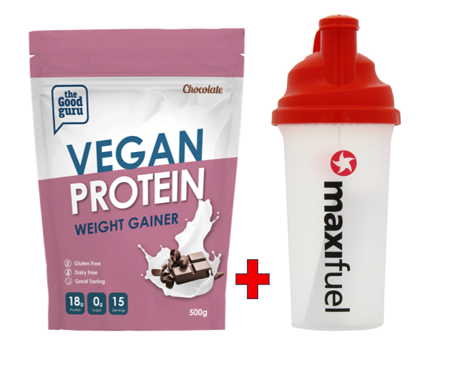 Vegan Protein Weight Gainer Chocolate 500g Gluten Dairy free Good guru + Shaker