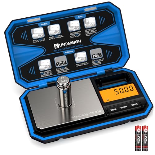 UNIWEIGH Digital Pocket Scales 200g/0.01g,Digital Gram Scales,Mini Food Scale with 50g Calibration Weight for Food,Powder,coffee,Coins,small items,Jewellry scale (Battery Included)-Blue