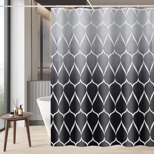 GERUIKE Weighted Shower Curtain 180 x 200 cm, Waterproof Anti-Mould Textile 130GSM Polyester Fabric, Machine Washable with 12 Rings & Grey Black Gradient Wave Pattern