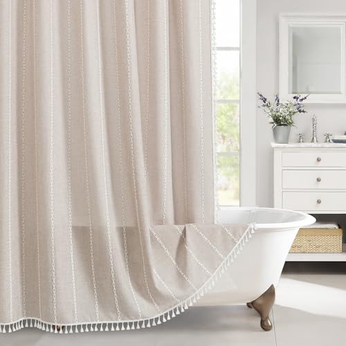 MitoVilla Boho Farmhouse Fabric Shower Curtain, Tan Brown Modern Cotton Linen Shower Curtains for Vintage Country Bathroom Decor, Tassel Weighted & Thick Waterproof Cloth, Taupe, 72 x 72