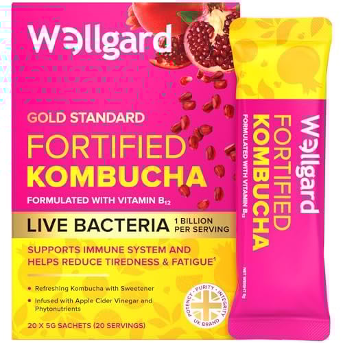 Wellgard Fortified Kombucha, Vegan Probiotic Drink Sticks, 1 Billion CFU Bacillus Coagulans, Prebiotics, Vitamin B?? for Immune & Energy, 20 Sticks