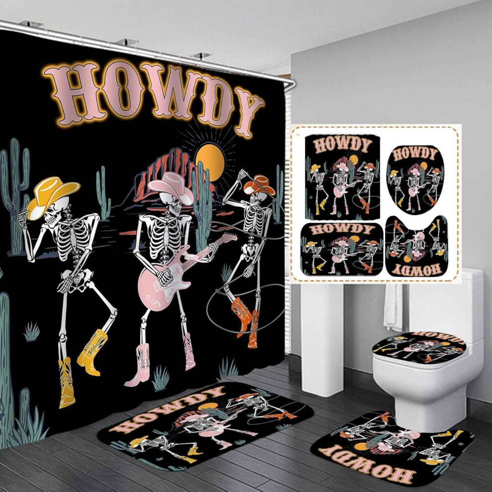 4PCS Cowboy Shower Curtain Set with Boots, Horse, Cow Skull & Cactus | Waterproof & Non-Slip Bath Mat | Western Style Bathroom Decor