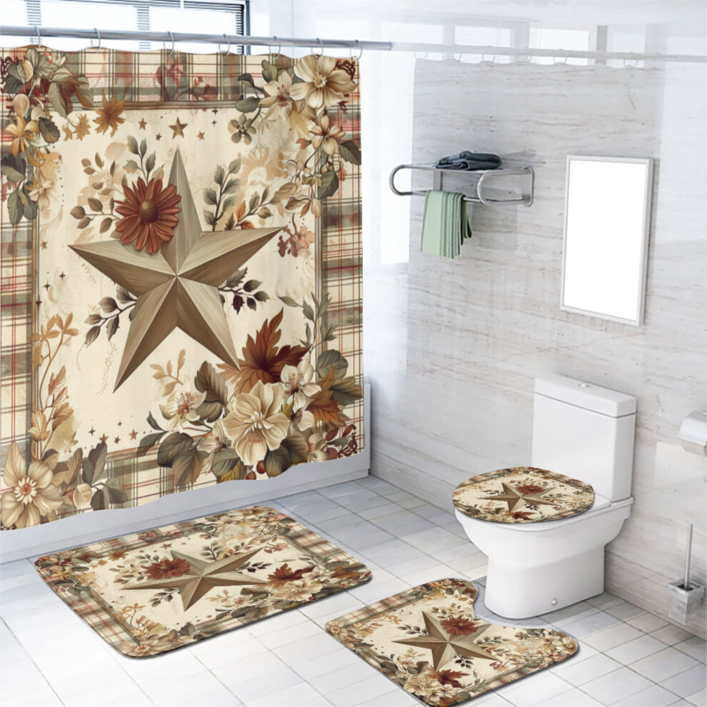 4PC Texas Star Flag Shower Set with Rugs, Toilet Cover & Mat, Compatible with Western Theme, Patriotic Bathroom Decor