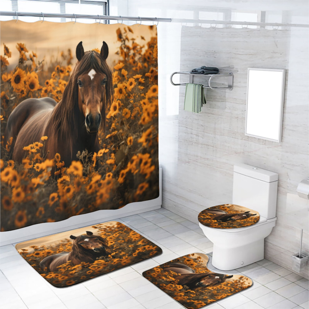 Horse Shower Curtain Set with Rugs - Rustic Western Animal & Sunflower Bathroom Decor, 72x72 Inch