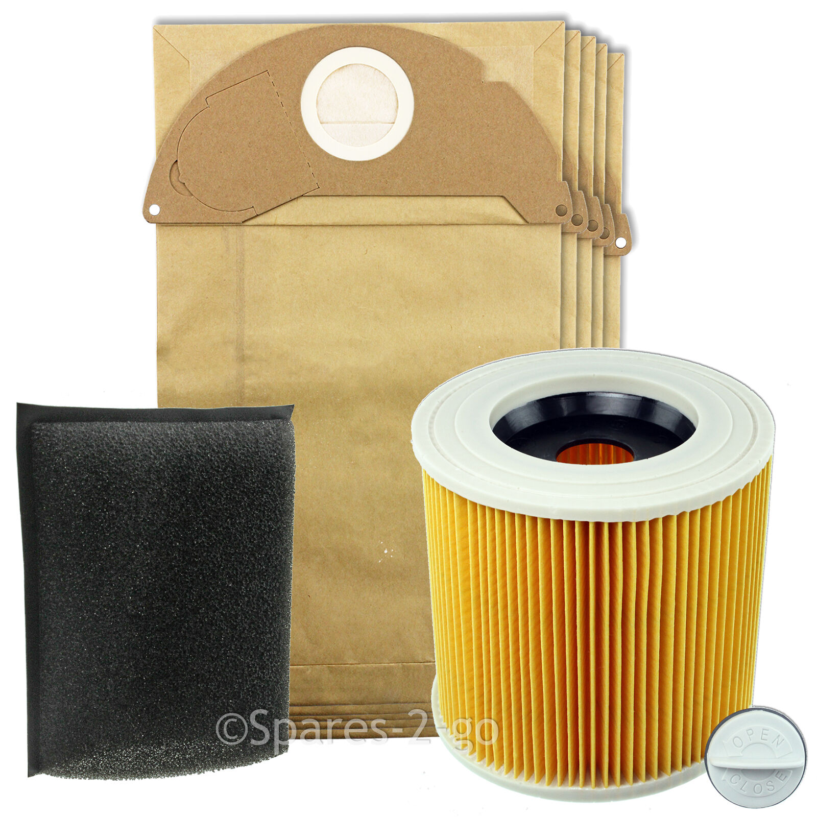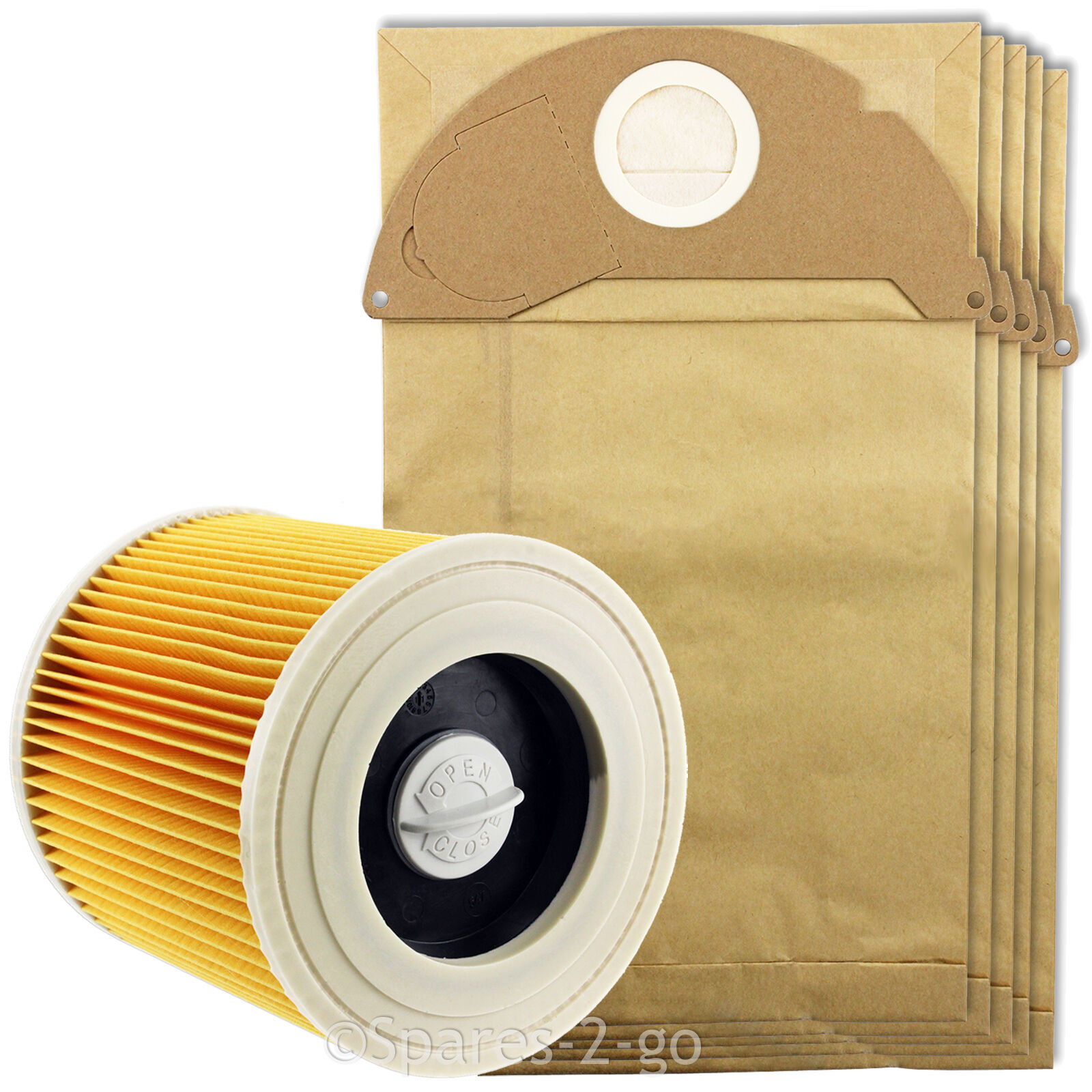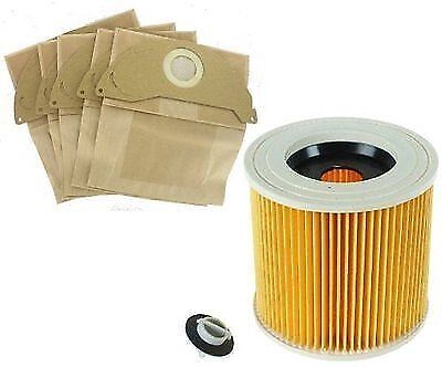 KARCHER Wet & Dry Vacuum Hoover Filter Cartridge + 5 Pk Dust Bags WD2200 WD2240
