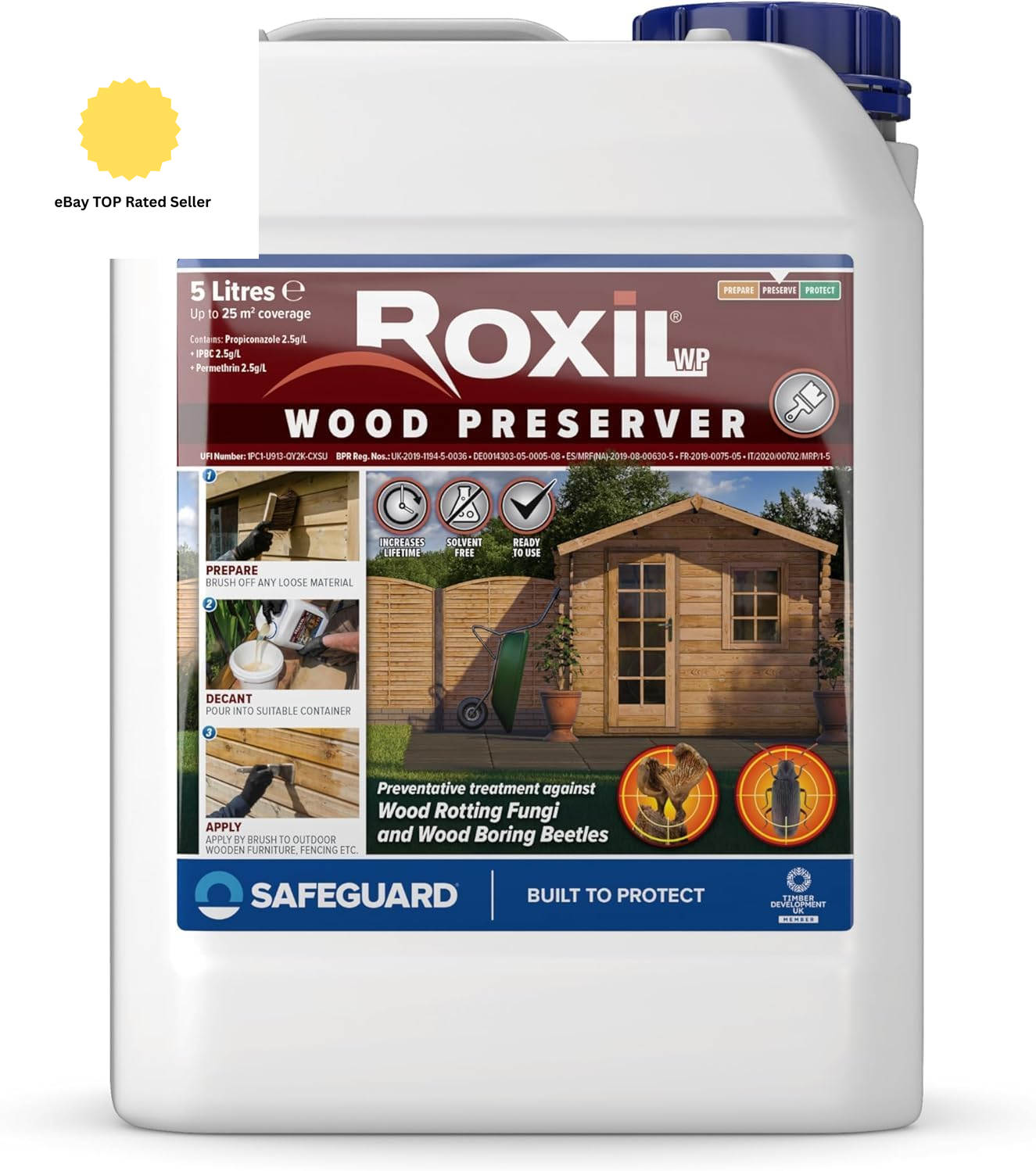 Roxil Wood Preserver Clear (5L) Odourless Pre-Treatment Wood Preservative Against Dry Rot, Wet Rot, Fungal Attack and Woodworm. Solvent Free, Ready to Use, for Outdoor Fence, Decking & Shed