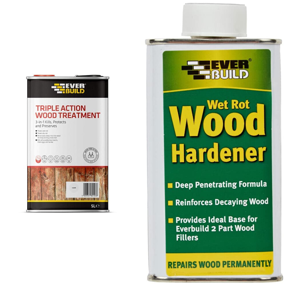 Everbuild Triple Action Wood Treatment | Kills and Protects Against Wood Rot and Wood Boring Insects - Clear - 5 Litr & WOODHARD2 LumberIrwin Wet Rot Wood Hardener 250ml