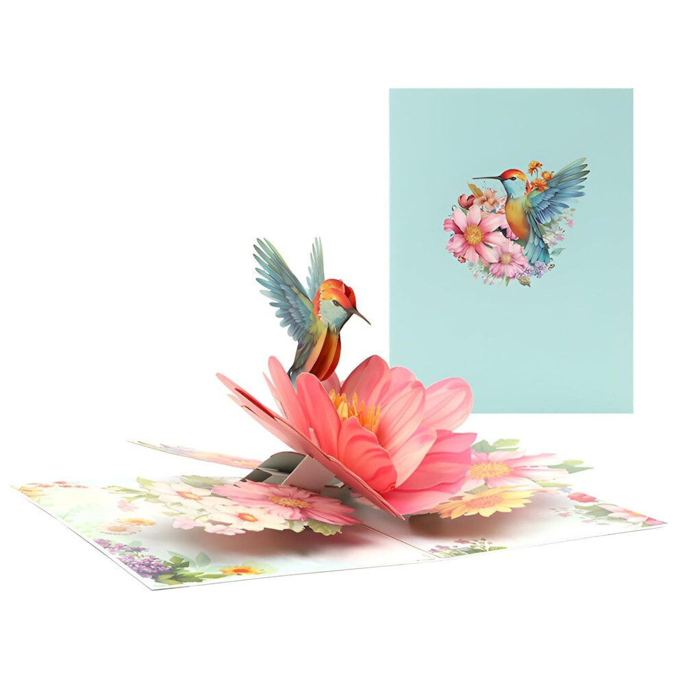 Handmade Greeting Card with 3D Hummingbird Hibiscus, Surprising Moment When Opened, Vibrant 3D Pop-Up Design Greeting Card for Birthday Mother's Day C