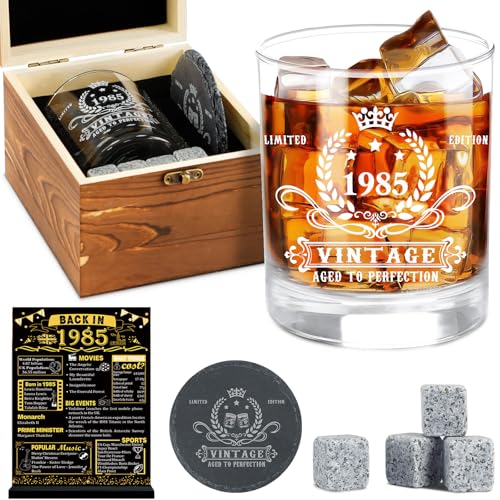 Amosking 40th Birthday Gifts for Men,Vintage 1985 Whiskey Glass Set,Wood Box & Whiskey Stones & 1985 Poster Anniversary Card & Coaster,Birthday Gifts Ideas for Him,Husband,Dad