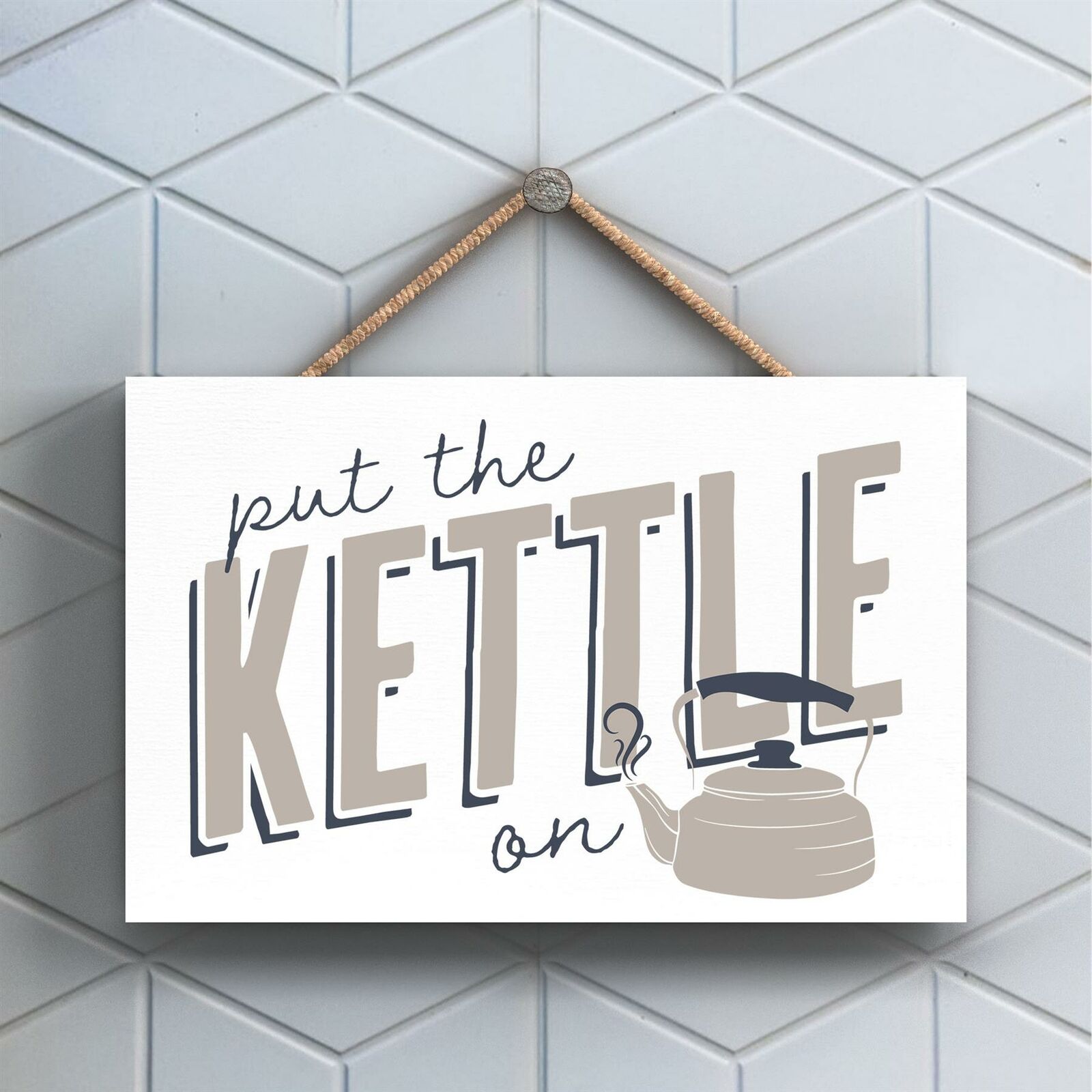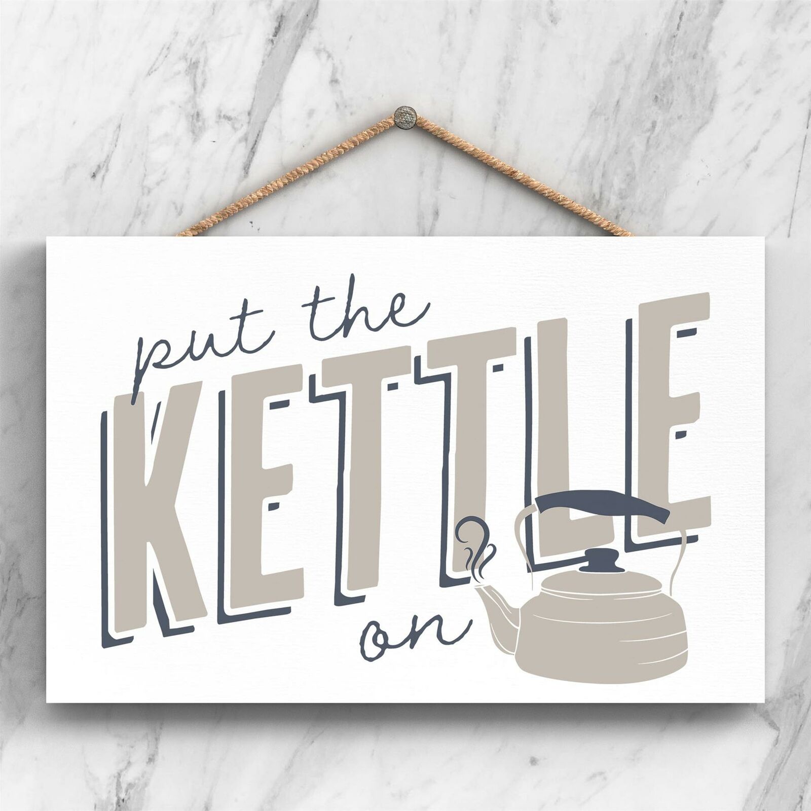 PUT THE KETTLE ON MODERN GREY TYPOGRAPHY HOME HUMOUR WOODEN HANGING PLAQUE