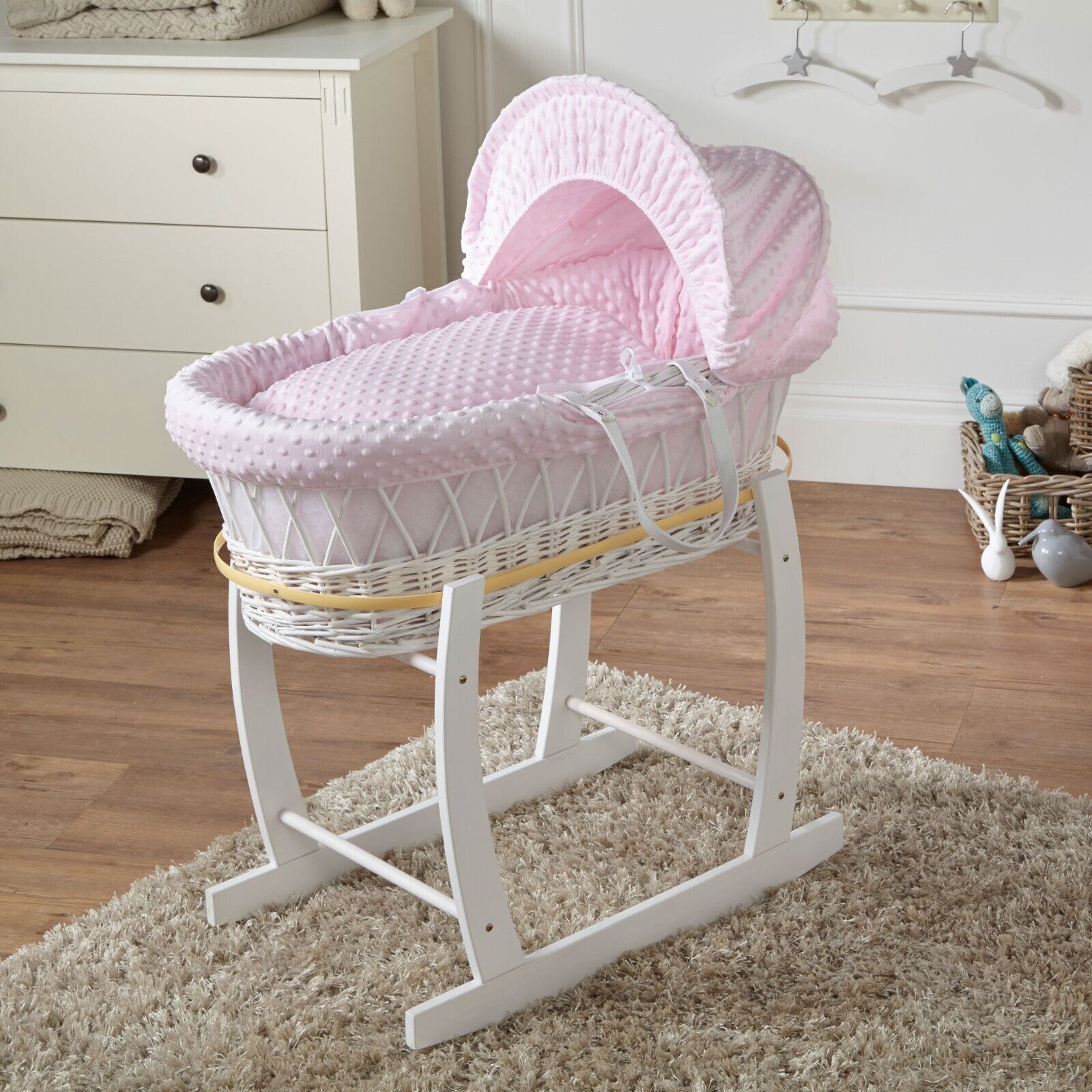 Babymam Moses Basket Wicker White Rocking Stand Baby Padded Dimple Pink Bedding Full Set with Mattress