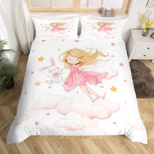 Homewish Cute Pink and White Duvet Cover Set for Kids Girls Bedding Single Size, Cartoon Rabbit Quilt Cover Kawaii Pink Yellow Stars Bed Sets with 1 Pillowcase, Sweet Princess Bedroom Decor