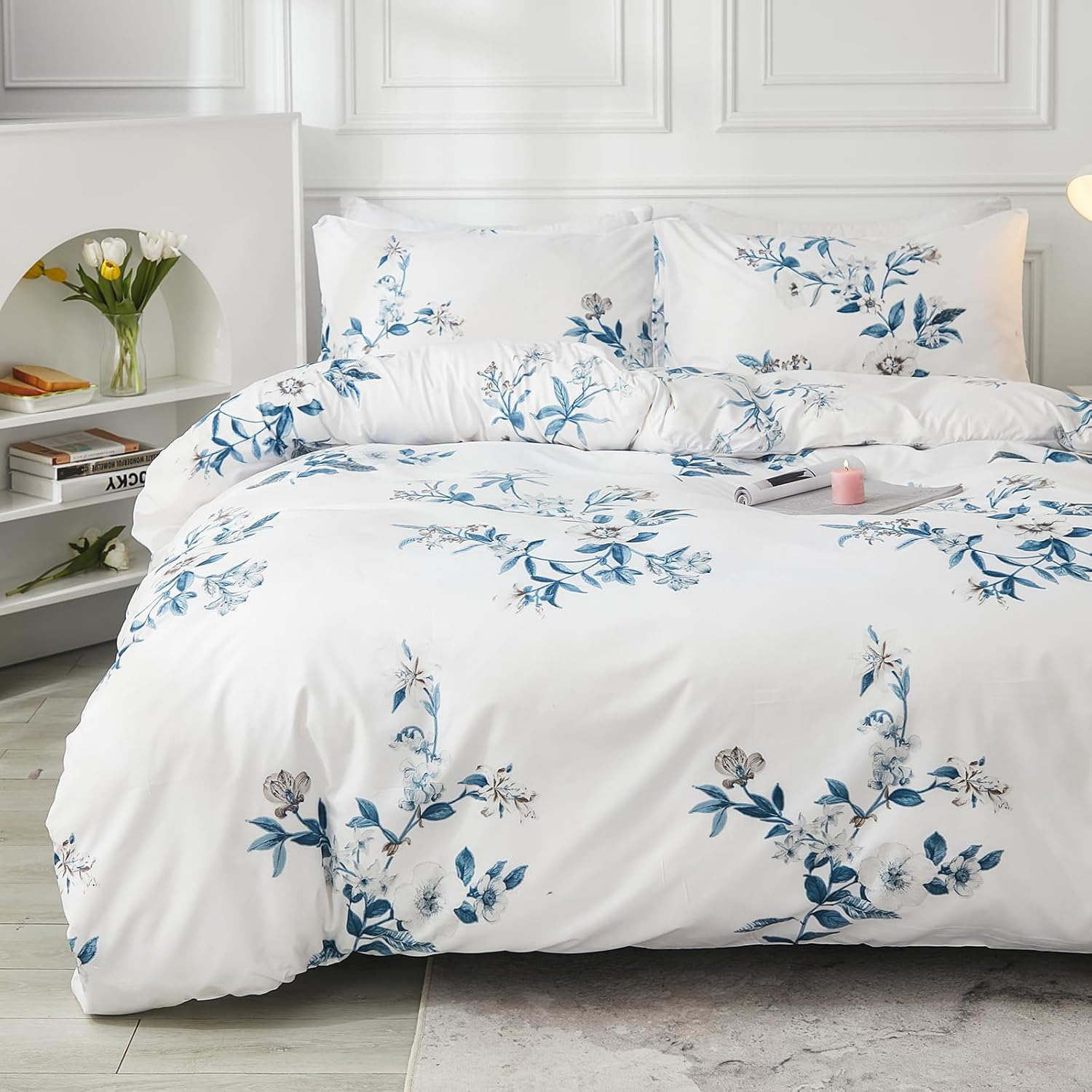 Herside Blue Flowers Duvet Cover Set King White Floral Bedding Blue Pink Flowers