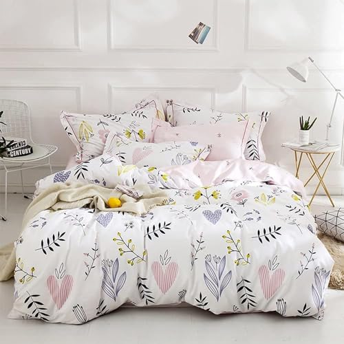 Lanqinglv Double Duvet Cover Set Pink White for Kids Girls,Heart Floral Pattern Bedding Reversible Comforter Cover 200x200 cm with Zipper Closure and 2 Pillowcases 50x75 cm