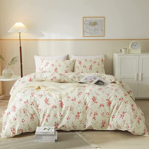 AMWAN Garden Style Pink Floral Duvet Cover Twin Chic Shabby White Pink Floral Bedding Sets 100% Cotton Botanical Comforter Cover Aesthetic Boho Bedding Collection