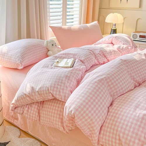 Michorinee Double Duvet Cover Set Pink White Gingham Plaid Pattern Country Style Bedding Set Aesthetic Cute Soft 110g/㎡ Washed Microfibre Girls Quilt Cover with 2 Pillowcases 50x75 Zipper Closure