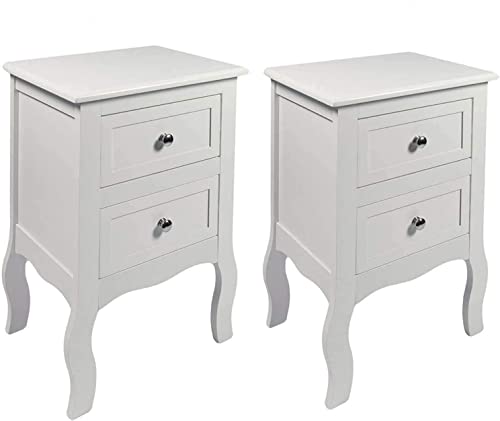 FEFE® 2 x Chic White Wooden Free Standing Bedroom Bedside Table Unit Cabinet Nightstand with 2 Drawers, White Bedside Table with Storage Cabinet for Bedroom, End Side Table Living Room