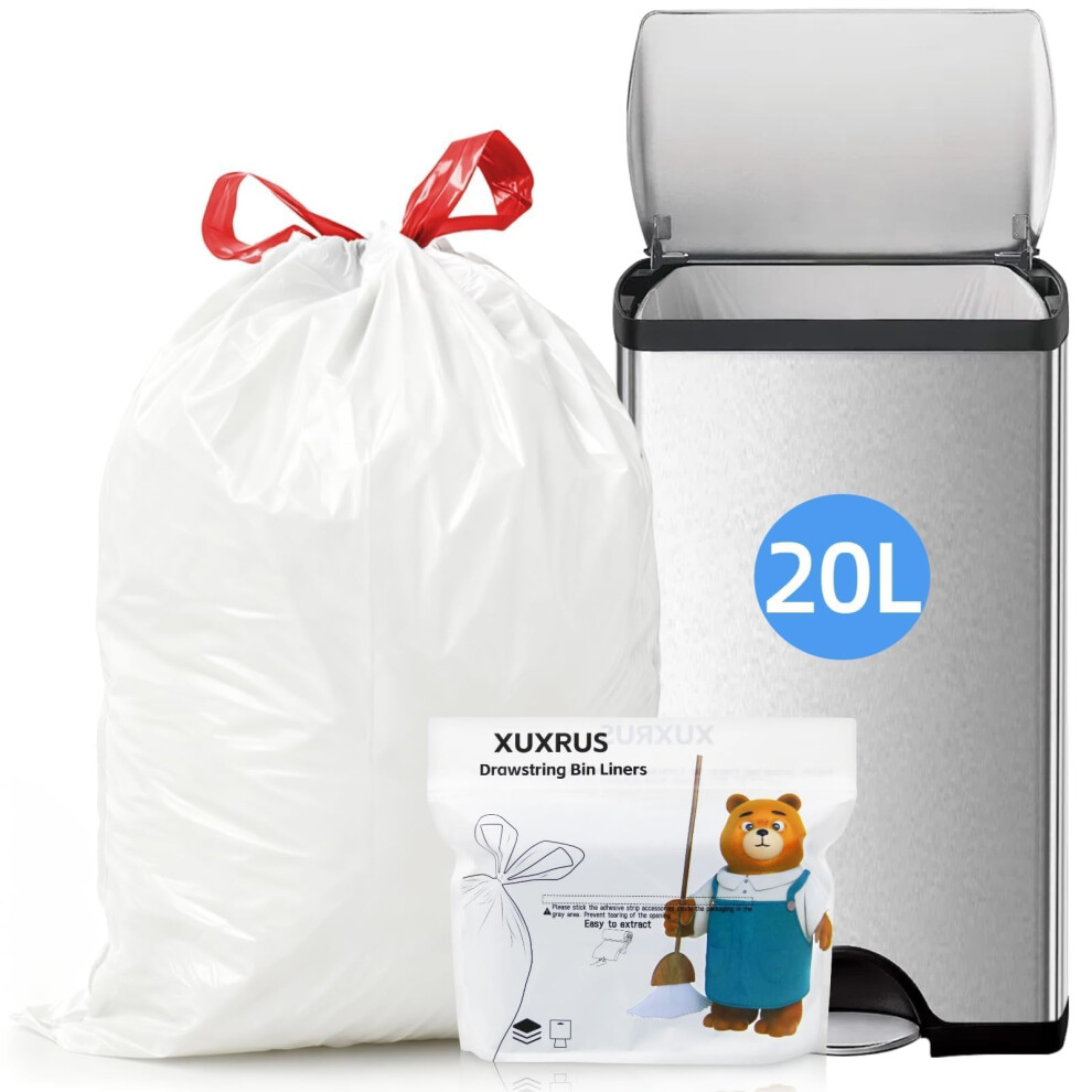 XUXRUS White Rubbish Bin Kitchen Bags Tie Handles 20L Strong Pedal Bin Liners Small, 60 Count Tear-Resistant, Easy-Dispense Drawstring Bathroom Trash