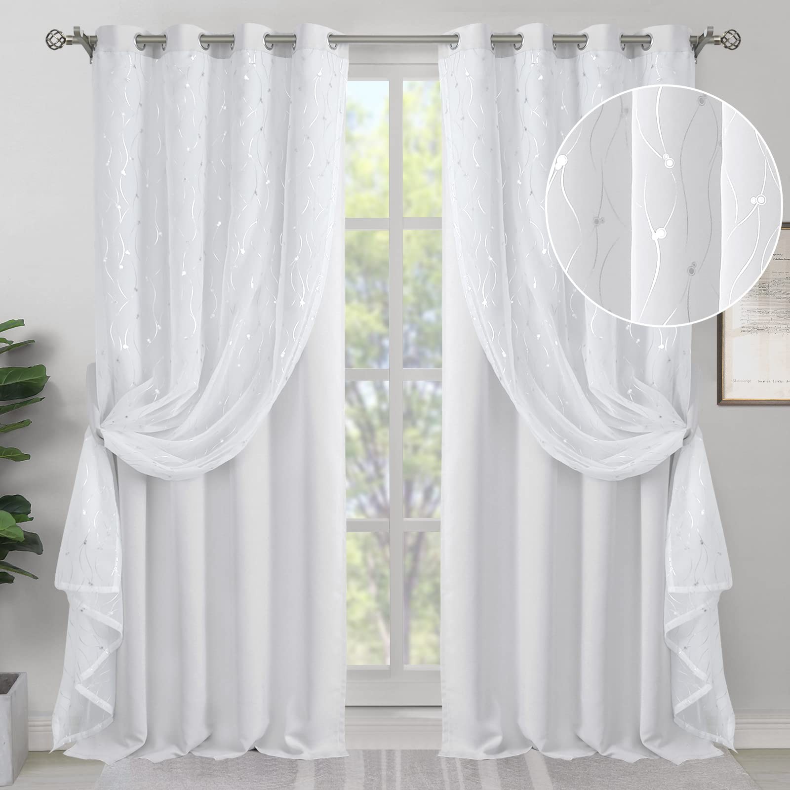 BGment White Blackout Curtains with Sheer Overlay, Silver Printed Tulle Double Layer Grommet Thermal Insulated Window Curtains for Bedroom/Living Room, 2 Panels Each 52 x 63 Inch, Pure White