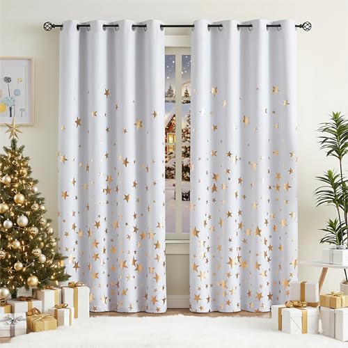 Treatmentex White Gold Blackout Curtains for Living Room 90 inch Drop Eyelet Curtains for Bedroom Star Pattern Foil Thermal Insulated Window Curtain Panels 2 Panels