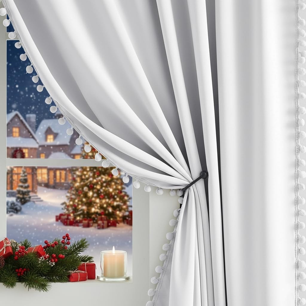 Treatmentex White Blackout Curtains for Living Room Bedroom 84inch Long Pom Pom Curtain Panels for Windows Thermal Insulated Curtains for Kids Nursery Room Rod Pocket 52" W x 2pcs