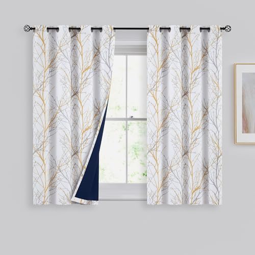 Fmfunctex White Gold Blackout Curtains for Living Room 90 inch Drop Eyelet Curtains for Bedroom Tree Branch Foil Thermal Insulated Window Curtain Panels 2 Panels