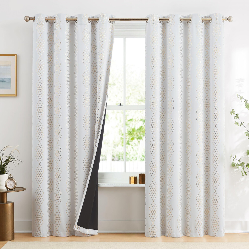 ugoutry White/Gold Full Blackout Curtains for Bedroom Metallic Geometric Diamond Pattern Curtains 96 Inches Long Living Room Darkening Thermal Insulat