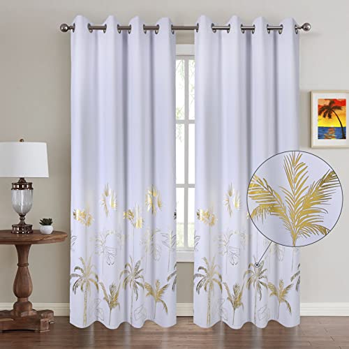Chlophy White Blackout Curtains Gold Foil Printed Palm Leaves Trees Luxury Bedroom Eyelet 66×90 Lined Thermal 100% Total Room Darkening Window Curtain Living Room 2 Panels Nursery Boys Girls