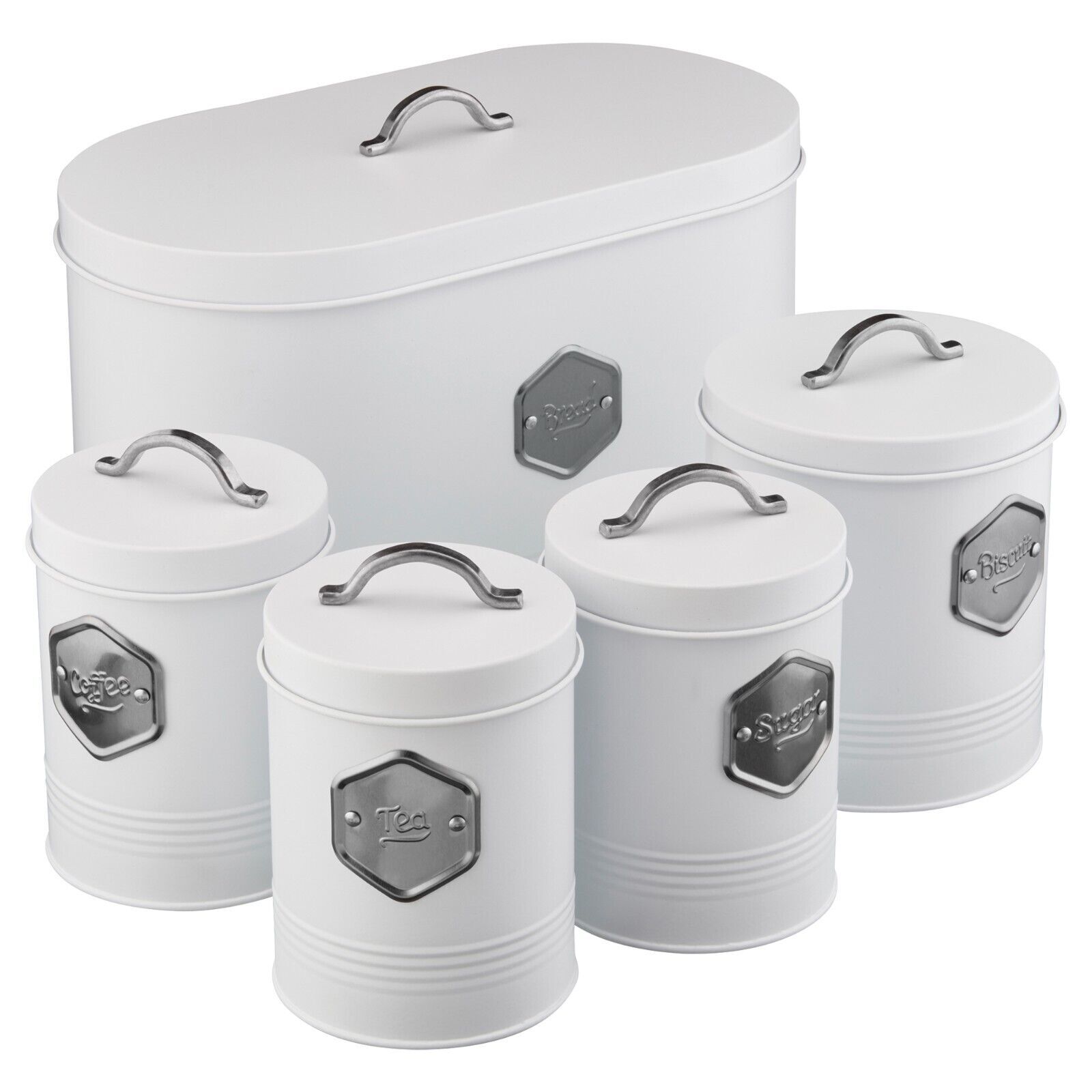 LIVIVO 5pc Kitchen Storage Set w/ Bread Bin Tea Coffee Sugar Biscuit Tins White